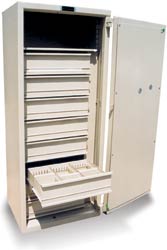 Per questo Technarredi ha realizzato un armadio blindato con cassetti, scorrevoli su guide telescopiche a totale estrazione per la protezione e consultazione delle schede.